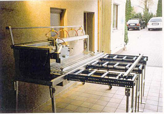 Arbeitstisch zugerüstet mit manuell auf- und absenkbaren Schwerlastrollen,